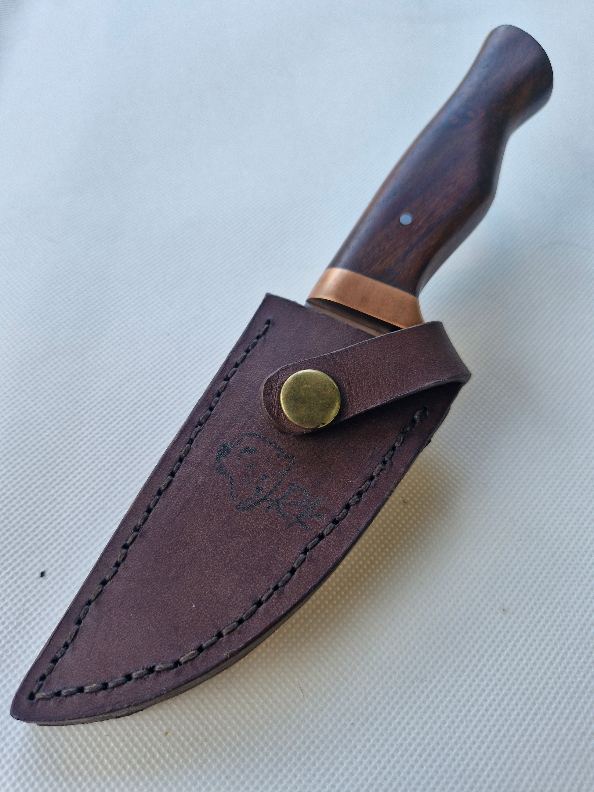 For the Handle material we have selected Kiaat wood (Pterocarpus Angolensis). This wood is renowned for its strenght and durability which makes it perfect for Knife handles. While doing a hidden tang fitment on this unique piece we have also added a Copper guard adding to the vintage look. Finally securing all together with a Stainless steel pin.
